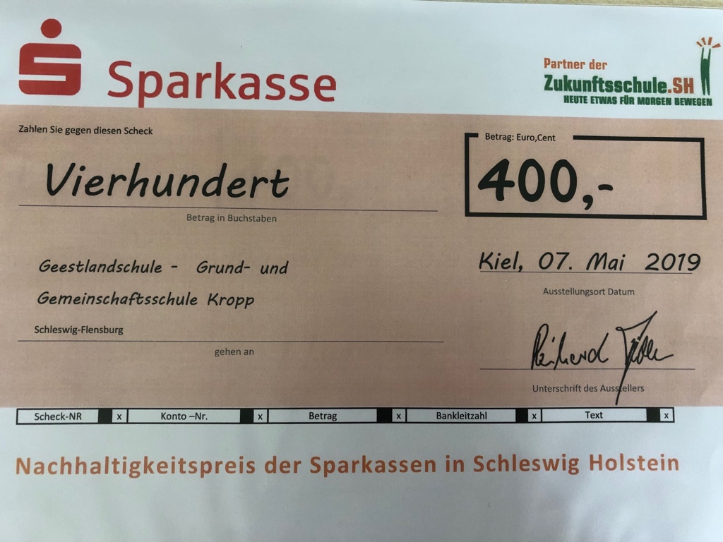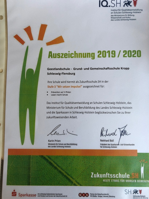 Wir wurden 2019 in der höchsten Stufe der Zertifizierung als Zukunftsschule ausgewiesen. Bei der Verleihung erhielten wir als Würdigung unserer Arbeit einen dicken Scheck über 400 Euro. Das Geld dürfen wir in unsere zukunftsorientierten Projekte reinvestieren.